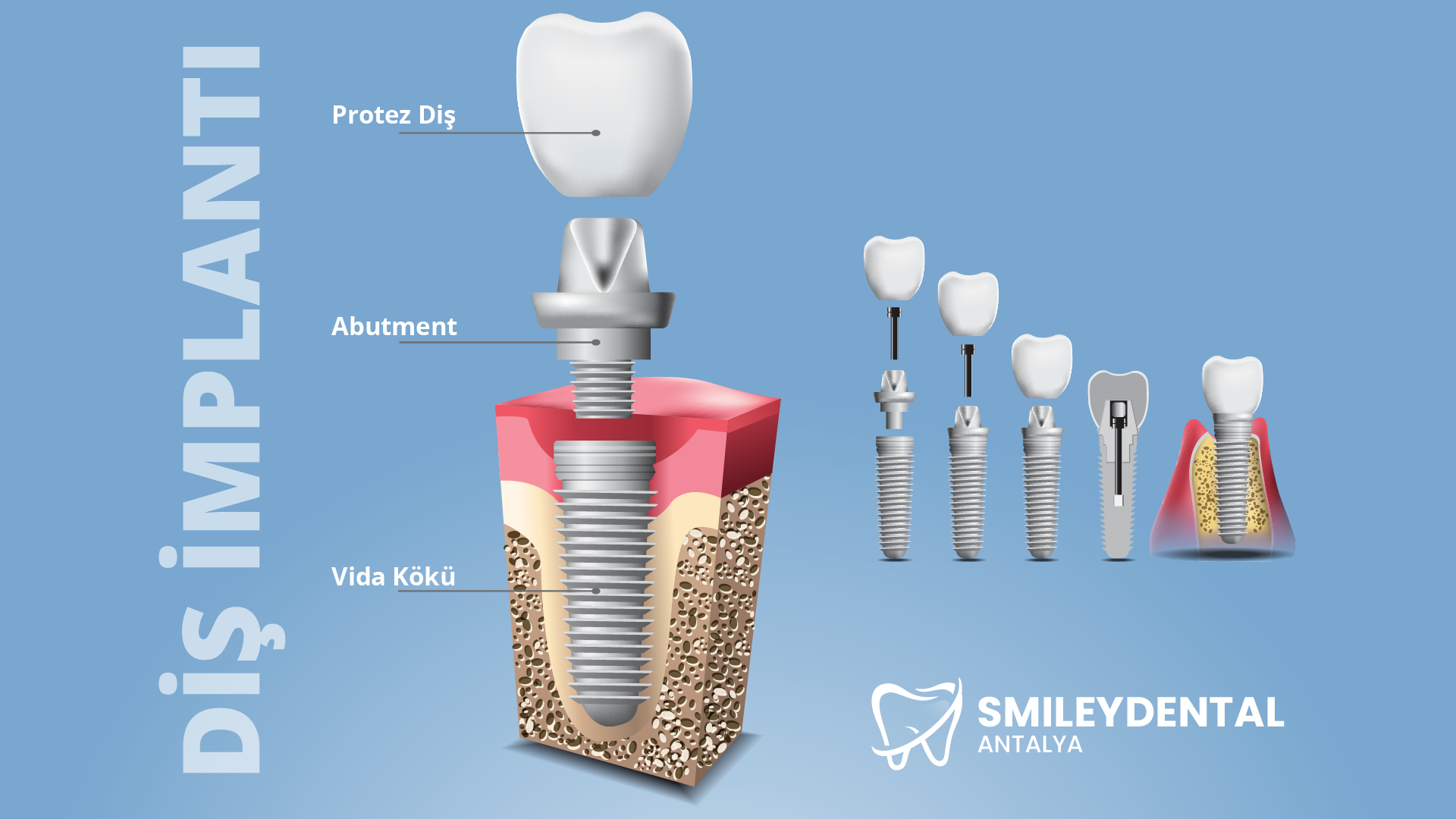 Diş implantı, yapay diş köklerinin cerrahi olarak çene kemiğine yerleştirildiği bir prosedürdür. Bu implantlar, titanyum gibi biyouyumlu malzemelerden yapılır ve vücut tarafından kabul edilirler. İmplantlar, eksik dişlerin yerine geçer ve üzerlerine porselen veya seramik kaplamalar eklenerek doğal dişlere benzer bir görünüm ve işlev kazanır.